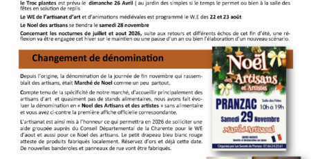 Lettre d'information de Pranzac Les dates des animations de 2026 Changement de dénomination Commande groupée de vin de Pranzac Un...